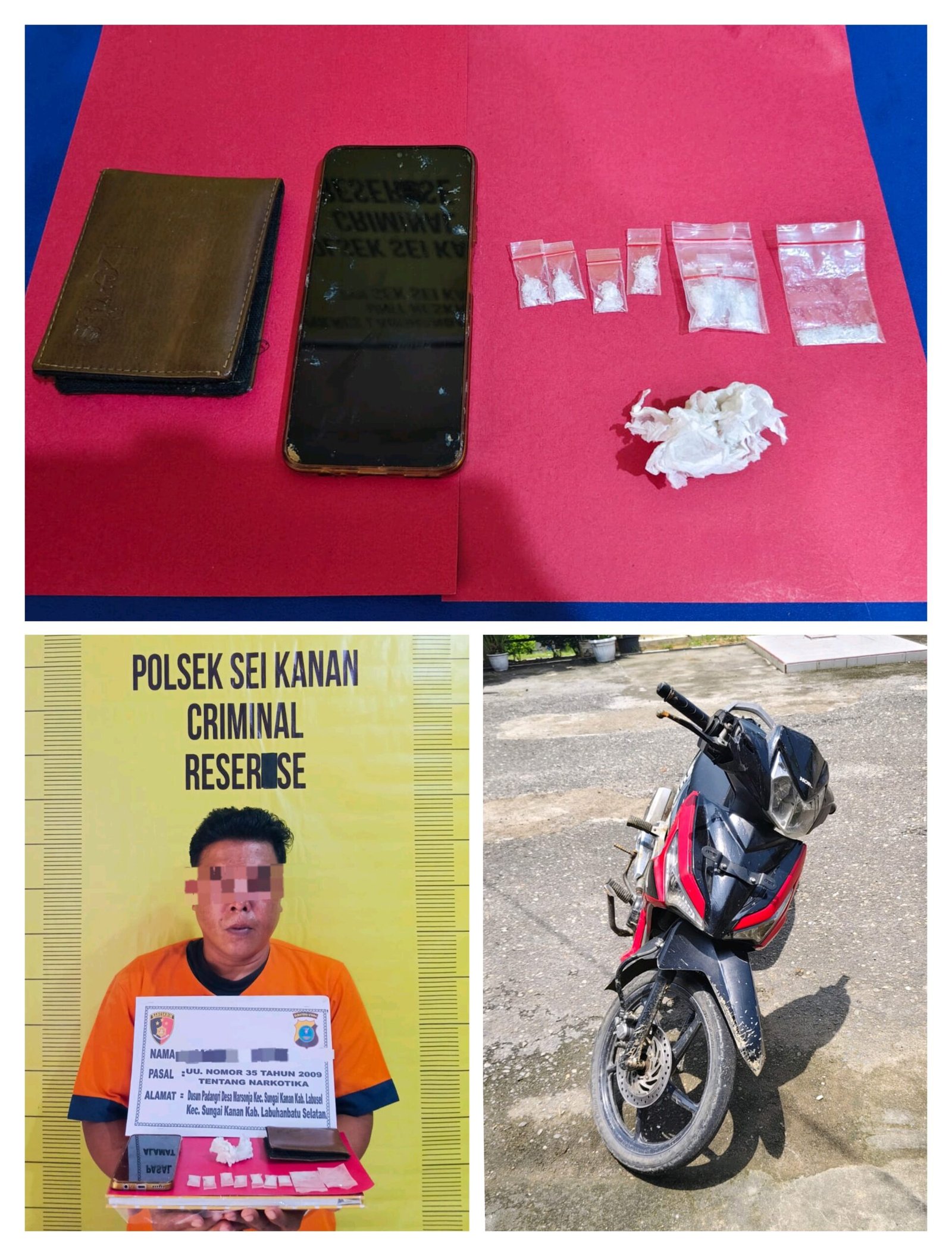 Adapun barang bukti yang berhasil diamankan berupa 7 bungkus plastik klip kecil transparan dan 1 bungkus plastik sedang berisi diduga narkotika jenis sabu dengan berat bruto 2,42 gram. Selain itu, turut diamankan 1 unit handphone merek ZTE, 1 unit sepeda motor Honda Supra X 125 tanpa plat nomor, 1 buah dompet warna coklat, serta 1 buah tisu.